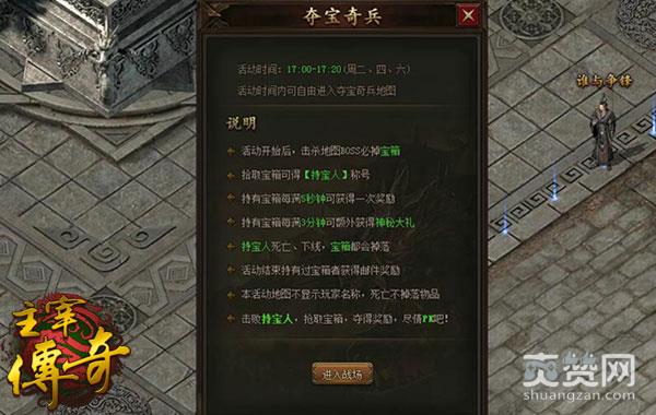 宝藏,永远是玛法大陆上勇士们的欲望之源。在哥们网《主宰传奇》中,夺宝奇兵是限时玩法,勇士在指定时间参与活动,可以尽情PK击杀BOSS。想成为宝箱的持有者,坐拥金银财宝么?快跟着小编来看看吧!