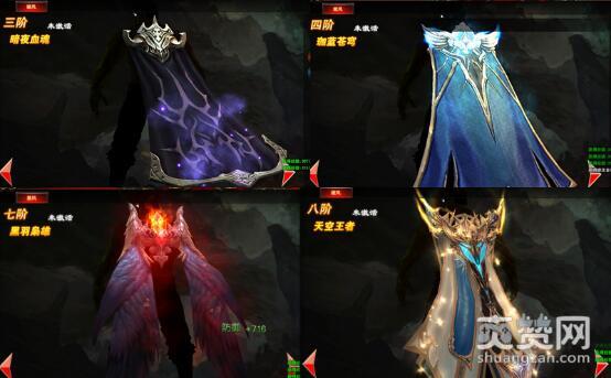 每一阶披风的外形各不相同,傲天魔法王座小编只简单挑选了三阶的暗夜血魂和四阶的珈南苍穹,以及七、八阶的黑羽枭雄、天空王者等四种披风来欣赏一下。虽无法窥探到它最终增加的战力,一睹风采也是不错的。