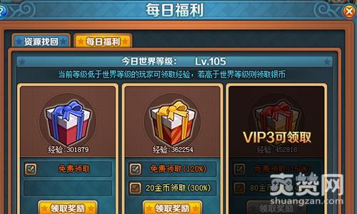 每日零点将根据当前服务器等级前20位玩家的等级均值算出今日的世界等级。若当前等级低于世界等级,则可以再福利礼包中领取到经验奖励,若高于世界等级,则获得银币奖励。每一个礼包每日只能领取一次,玩家可以选择免费领取或花费小额金币享受高额的奖励加成。所有玩家每日均可领取至少2个福利礼包,VIP3以上玩家每日可以领取到3个福利礼包。