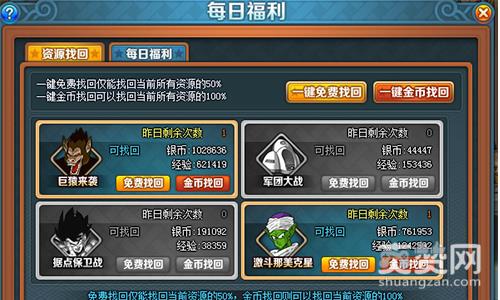 玩家可以通过资源找回昨日未参与的游戏内容的经验、银币等。在资源找回中,免费或一键免费找回,仅能找回当前资源的50% 金币或一键金币找回,可以找回当前资源的100% (每项内容仅免费或金币找回一次)