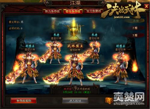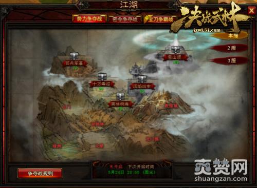 一入江湖岁月催,51《决战武林》中势力争夺战、密令争夺战到宝刀争夺战,本就是一条永无止境的不归路。一开始进入的势力争夺战,玩家可以看到本服的盟主帮会,也可以看到其他服务器盟主帮会的所有格局。参与51《决战武林》势力争夺战,先要了解争夺战的规则。一句话,只要实力够强,大伙够团结占领旗帜坚守住 20 分钟完全不是什么难事。活动结束后,获胜的一方将获得大量经验、真气、金币和帮贡奖励;败方如果也有 15 分钟的占领时间也能获得以上的奖励。此外,胜方的帮众每日可领取实力相应的奖励。