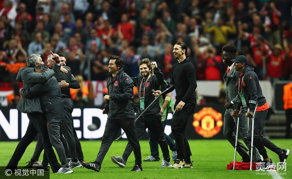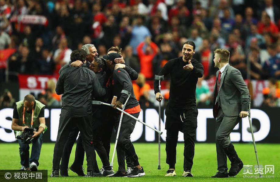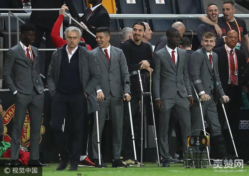 曼联夺欧联杯冠军,欧联杯曼联和阿贾克斯的决赛,替补席上的曼联球员都冲进场内庆祝夺冠,这里面有一群特殊的曼联球员,说特殊,是因为这些球员都是曼联的伤号,都拄着拐杖。伊布、罗霍、阿什利-扬和卢克-肖都两只手各拄着一支拐杖站着看球。