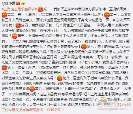 黄小蕾在微博还原事发经过,她指名道姓要投诉《七个小矮人》矿车项目赵姓员工,不仅全程没有笑容、态度冷漠,明明女儿玩游乐设施符合身高标准,居然找各种理由刻意刁难,此外在争执过程中不慎抓伤男员工,却被对方指控打人,让她反控腰也被扭伤对方是否也要负责,不过最令她无法接受的,则是跟迪士尼投诉此事不仅没人回应,还仗着丰厚媒体资源,对发生争执游客进行各种公开抹黑及制造恶意评论人身攻击,此外上海迪士尼没有投诉部门,仅设有咨询部门,就算客诉也是无济于事,让她痛批没有爱心和责任心的工作人员,根本不配做为孩子服务的工作。