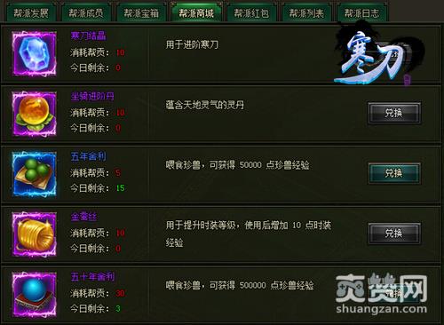 9377《寒刀》帮派商城是大侠帮贡消耗的主要途径,商城内出售各类进阶、强化道具。通过这里,各帮众实力便能稳步上升,帮会实力将会蒸蒸日上吧~!正所谓独乐乐不如众乐乐,在游戏里得到稀有装备很高兴?何不丢个帮派红包与大家分享快乐呢?各位~各位~又有大哥发红包啦,快点来抢吧~!