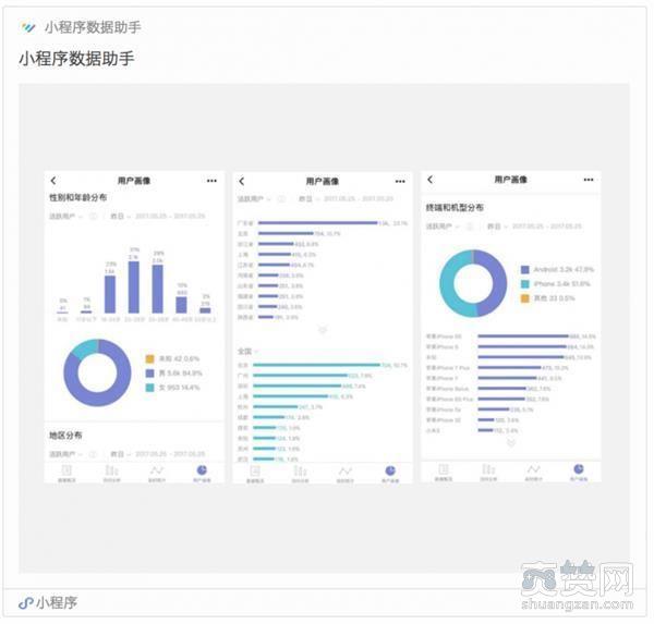1、新增 “用户画像” 数据。支持查看小程序新增或活跃用户的性别、年龄、地区、设备分布。开发者可以登录小程序后台,进入数据分析 -> 用户画像,或点击下方小程序数据助手查看相关数据(数据每天早上更新)。