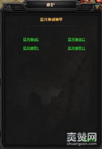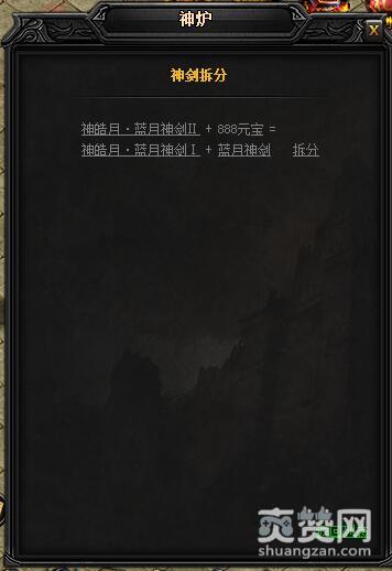 拆分的方法是到神炉处,点击蓝月神兵中的神剑神甲,然后在弹出的对话框中选择一项。这里我们选择的是蓝月神剑II。