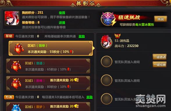 选择难度等级,发起组队邀请,再强BOSS也不怕!对于自信的玩家也可以尝试单挑BOSS!开启及通关葬影谷每个区域,不仅有元宝奖励,还可获得积分用于萃取装备碎片激活装备,通关及装备升级对应开启下一等级区域,所谓越战越强,越强越战!