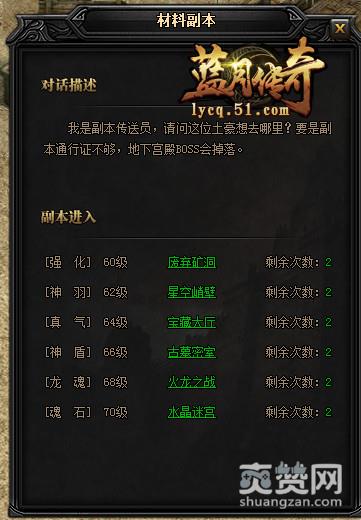 51《蓝月传奇》材料副本包括:废弃矿洞、星空峭壁、宝藏大厅、古墓密室、火龙之战与水晶迷宫,每个副本每天可进入2次。由于难度系数的不同,对应的玩家进入等级也不同。
