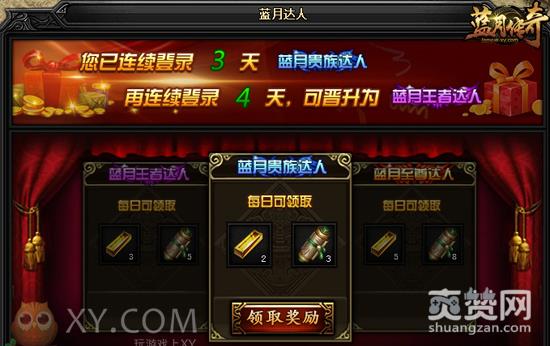只要玩家连续3天登陆XY游戏《蓝月传奇》就可获得“蓝月贵族达人”的称号,不仅可以彰显尊贵身份,还可以为玩家带来高额的角色属性加成,让你不光身份成为贵族,就连实力也是贵族级别!当玩家连续登陆7天之后,不仅会获得“蓝月王者达人”称号,而且增加的属性也更多。要是玩家连续登陆30天的话,不仅将会获得最具尊荣的“蓝月至尊达人”称号,就连角色属性也会获得至尊加成!