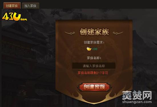 点击主界面“家族”按钮或快捷键“G”可打开家族面板,默认显示“创建家族”页面,当然创建家族还需要消耗100元宝作为条件的哦!达到条件的玩家可以输入自己家族名称,点击下方“创建家族”按钮进行创建即可。