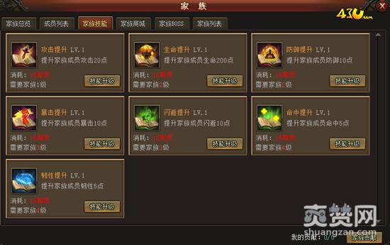 拥有家族的玩家可以通过升级家族扩展家族容纳的人数,提升家族技能,开放家族商城和召唤家族BOSS。升级家族条件需要家族成员平日收集一定的银两和捐献道具后获得的累积贡献度,当家族仓库资源满足升级消耗即可升级家族。