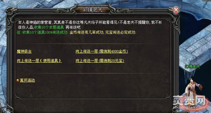 幻境神庙共有12层,玩家每次都会从第一层开始挑战,探索过程类似于我们小时候的闯关游戏,不过要想成功闯到下一关,还必须收集到任务指定的物品数量哦。作为土豪,怎么能没有一点特权呢,花费4000金币或20元宝即可实现传送。当玩家达到3、6、9和12层的时候,还可以领取一次丰厚的经验奖励,而率先抵达12层的前3名玩家更可以获得额外奖励。