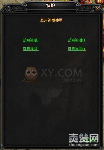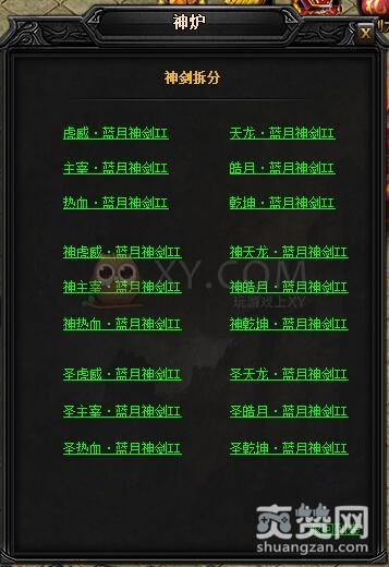 拆分的方法是到神炉处,点击蓝月神兵中的神剑神甲,然后在弹出的对话框中选择一项。这里我们选择的是蓝月神剑II。