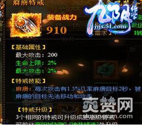 二、麻痹特戒:每次攻击有1.5%的几率麻痹目标2秒,被麻痹的目标无法移动和攻击;