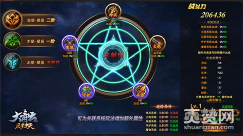 当玩家角色达到350级以上,即可开启星系系统。星系中包含金星系、木星系、水星系三大星系,每个星系下对应着5个升阶系统。金星系对应了宝甲、魔扇、圣纹、盾牌、坐骑;木星系对应了玉佩、灵玉、图腾、法宝、面具;水星系对应了神兵、魔像、守护、火炮、兵器。