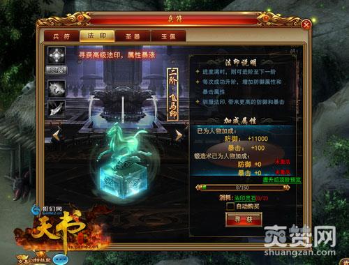 在哥们网《天书世界》,寻获法印的时候,每次都会增加进阶值,进阶值满则意味着成功驯服法印,获得相应属性加成。