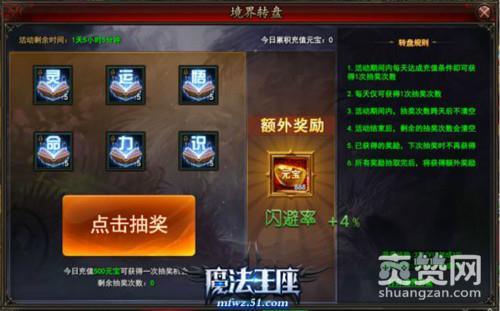 进入境界系统,想要让境界显示在玩家身上,就必须激活上图灵、运、悟、命、力、识六大境界达到一阶。如何激活上述境界?这就必须先了解下51《魔法王座》境界之书这个关键材料。这个关键的材料应该如何获得呢?打开境界转盘,通过抽奖可以获得,但这个活动往往有一定的时间限制。如果在规定的时间内没有把握好境界转盘,那估计想要全部激活还真有点困难。对此,51《魔法王座》小编可以负责任地告诉你,如果你是RMB玩家恭喜你,只需每日充值500元宝就一定能获得一次转动转盘的机会。