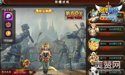 在ppwan《风色轨迹》中,荣耀试炼共有60关之多,达到相应的等级之后就可以试炼闯关。每一关都有一强力天神镇守把关,只要通过关卡的试炼就可以获得通关奖励和进击下一关的权利。
