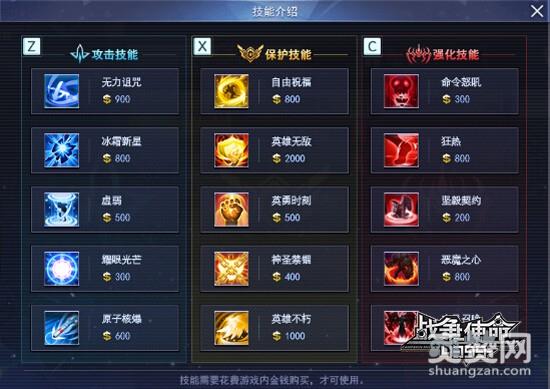 2. 在游戏中按Z、X、C键,可直接打开攻击技能的购买界面,按数字键选择要购买的技能,购买后技能会立即释放。Z键所对应的为攻击技能,X键所对应的为保护技能,C键所对应的为强化技能。
