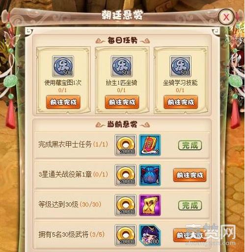 光有人还不行,金钱肯定也少不了。《乐蜀三国》中的朝廷悬赏任务就是赚钱的绝佳途径之一,在每日24:00刷新日常悬赏,每个玩家每日可完成3次日常悬赏从而获得大量银币。只有在完成当前全部悬赏后才可以领取超值宝箱,并开启下一批悬赏,不同等级的悬赏奖励自然也不同。