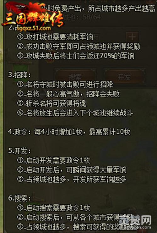 每位51《三国群雄传》都想成为一统天下的那个主,可如何才能能够一统天下呢?一统天下系统中分为:城池和摸金2大系统。城池中分为:占城,招降,政令,开发,搜索。占城:1攻打城池需要小号军饷。2成功击败守军即可占领城池并获得奖励。3攻城失败后将士们会返还70%军饷。占城奖励有:元宝,武将卡,将魂,招江令
