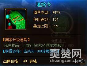地煞令是稀有的物品,是国家升级的道具,上缴便能获得3点国家贡献。