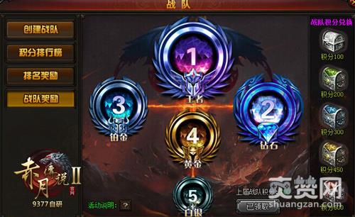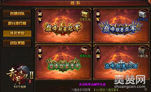 战队积分将参与全区全服积分排名,进入前八名的9377《赤月传说2》玩家在结算时获得战队排名称号奖励。战队积分达到对应级别如白银、黄金、白金、钻石和王者分段时,可领取对应阶段礼包,比如分数达到王者可领取王者礼包。