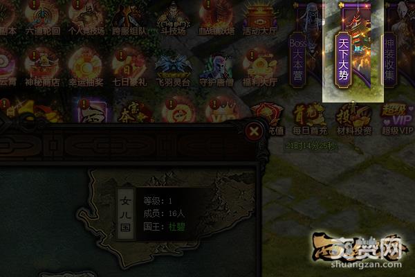 在《西游之路》游戏当中,玩家通过主界面右上方的“天下大势”系统入口,即可打开该系统的专属界面。而在界面当中,玩家可以自行浏览其中所包含的各种玩法,并了解每个玩法的规则、开启时间以及当前进行当中的情况。并且,其中的玩法都需要玩家以各自“国家”阵营为单位来参与。