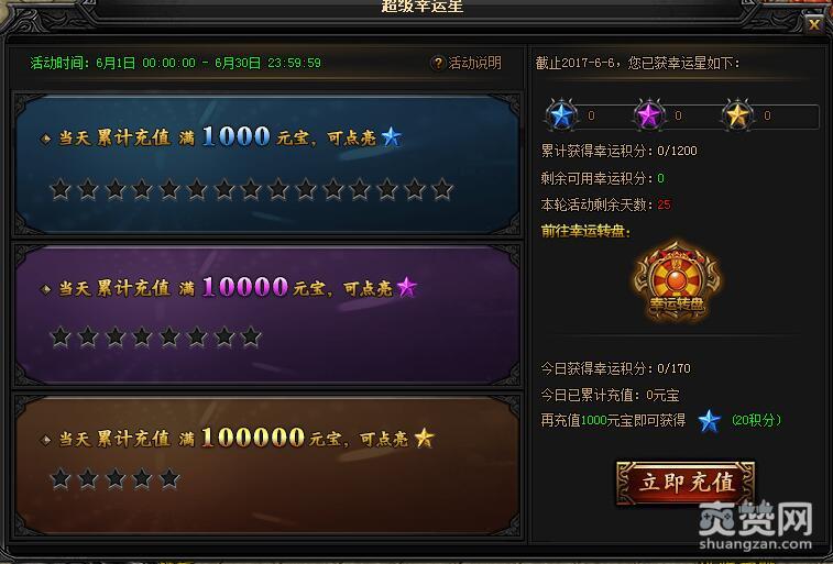 当天累计充值满1000元宝,可点亮蓝星,获得20积分。