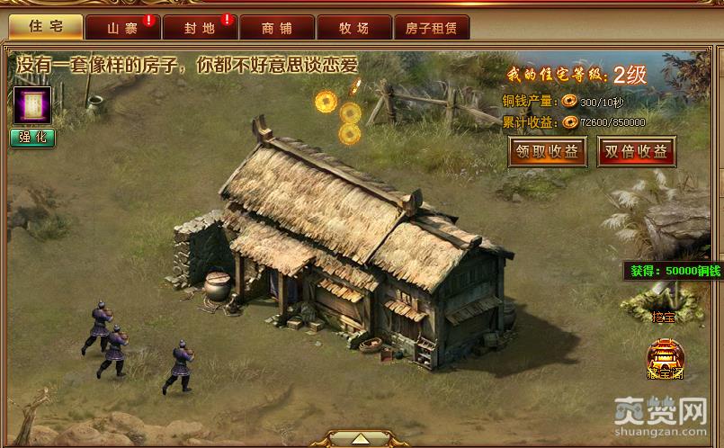 2、住宅:铜钱收入主要的来源之一,住宅的升级材料可以在挂打宝塔中获得,住宅内每30分钟 就可以无限挖宝一次,每次都能随机获得1W-5W的铜币奖励。