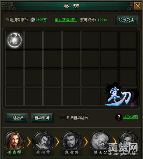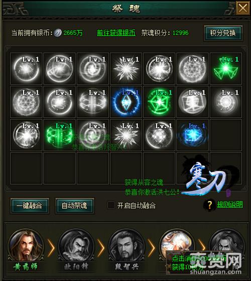 4、9377《寒刀》侠魂系统里还有一键融合功能以及自动祭魂功能,一键融合可快速融合紫色品质以下的侠魂。