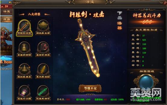 先从掌管攻击的轩辕剑说起,相传轩辕剑是天下能工巧匠专门为轩辕黄帝打造的神兵,有着开天辟地的强大威力,一般人无法轻易举起或者催动。傲天乾坤战纪中一开始的轩辕剑还仅仅算是下品神器,需要不断提升等级,用器魂值来不断养护才能持续提升高逼格的战力。右侧的攻击也才37,系统评估为下品也不是完全没有道理的。