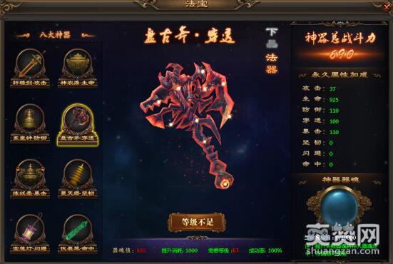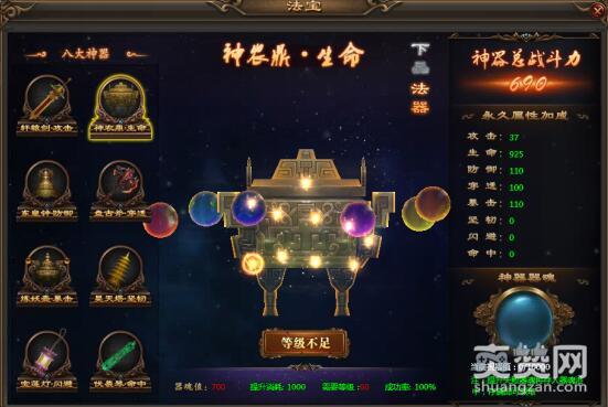 主管生命的神农鼎,相传是神农氏炼药的器物,采集天地之灵气、万物之精华。神农鼎内孕育了各种奇特的生命动能,可以帮助玩家大幅提升生命值。右侧925的生命值同样只能是初级下品的法器,想要傲天乾坤战纪中生命值强大,一定记得提升神农鼎的品阶喔。