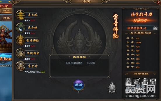 傲天乾坤战纪法宝系统中还有5大法宝,什么昊天塔、昆仑镜、雷音佛轮、万剑朝宗、东皇钟,这一切你都该好好看一下。要说最容易拿到的还是雷音佛轮,登录第三天就可以了,拿到它起码可以升级数千的战斗力。其次,东皇钟VIP2完成之后自然就送给你了!