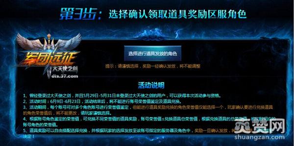 在活动期间,每个账号可对多个角色账号进行荣誉值鉴定,但能进行道具奖励兑换的角色荣誉值仅能选择一个,在这个时候,37《大天使之剑》的玩家就要选择奖励最丰富的那个角色账号进行兑换啦!确认要进行兑换道具的角色荣誉值后,将不能更改。