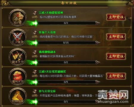 这类任务属于挂机任务,玩家在玩游戏的过程中就会自动完成!每日任务中还有能够获得道具神器的任务比如,完成3次仙盟摇钱树就可以获得稀有道具,而天帝宝库喙蟾蜍各种稀有道具,神器,特殊装备,是玩家不能错过的任务首选!想要成为高帅富就这么容易!