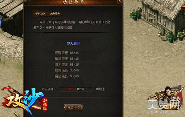 玩家每天可完成10次功勋任务,通过这些任务获得的功勋值便可以升级功勋称号!功勋称号除了体现在玩家外观上,还可以让玩家获得大量的属性加成!比如物理攻击、魔法攻击、道术攻击、物理免伤、魔法免伤等属性!