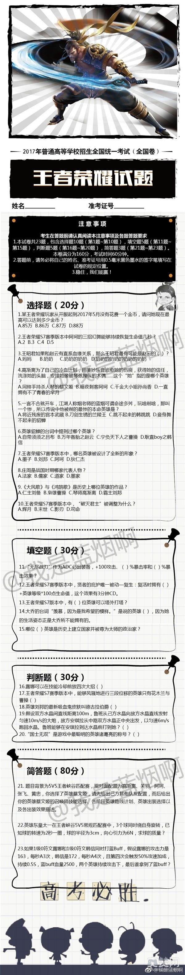 游戏主播@我是蓝烟啊 在微博公布了一份《王者荣耀》高考题,该试题分为选择、填空、判断、简答四种类型。