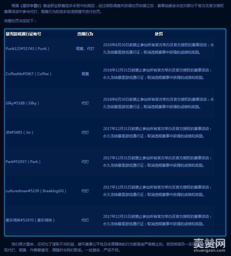 《星际争霸2》国服官方今日宣布了一则令中国星际玩家感到沉痛的消息,七位中国选手Punk、Coffee、Silky、Jin、Park、BreakingGG、麦乐鸡块因分别涉及假赛或是代打,最终被官方查出并处于不同程度的禁赛惩罚。