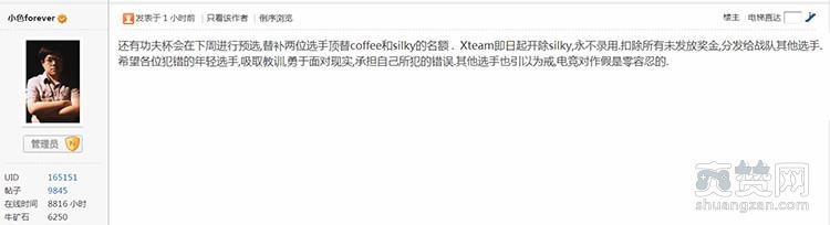 星际2解说黄旭东(小色)是代打涉案选手Silky的战队负责人,在事件曝光后,这位老解说也做出了自己的回应,Xteam即日起开除silky,永不录用,扣除未发放奖金分发给战队其他选手。并希望犯错的年轻选手引以为戒。