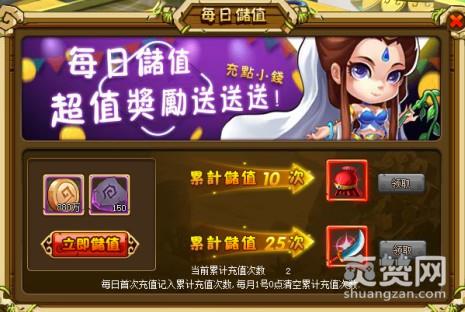 活动内容:玩家每天在游戏里充值一次后可以领取一次铜钱跟仙将石的奖励,自然月内累计充值达到10次和25次后可以额外领取装备奖励。