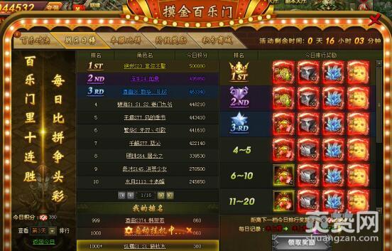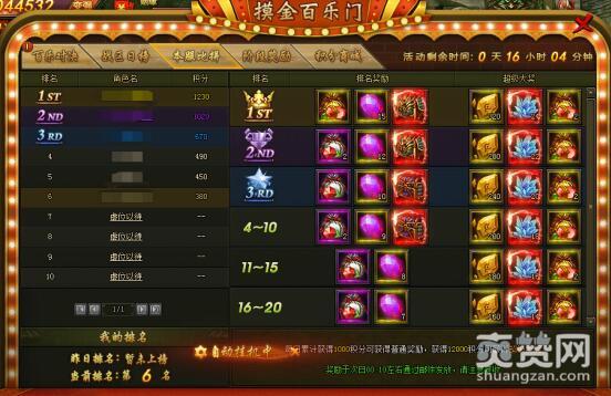 第三个区域是傲天盗墓笔记游戏关于本服摸金百乐门比拼结果的。摸金百乐门每日都会在本服中进行PK,上榜者将会获得许多闪耀的奖励。奖励分为两类,一类是非常容易拿到的排名奖励,另一类是需要积分达到一定程度的超级大奖。加油吧,昨天小编混了个第六名喔。