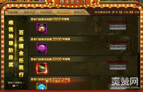 第四大区域展示的是摸金百乐门的阶段性奖励。都有什么奖励?积分达到1000就可以获得宝石袋,达到2000分可以领取超级经验丹,5000分、8000分、1000分甚至更高都会有各式各样的奖励。“唯我独尊阶段奖,百乐摸金任我行!”这就是傲天盗墓笔记中霸气的摸金口号。