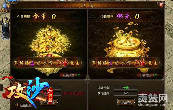 1、在游戏中,祈福是一种福利玩法,玩家可通过祈福暴击大量的金币和绑元,祈福次数越多,得到的奖励就越多;