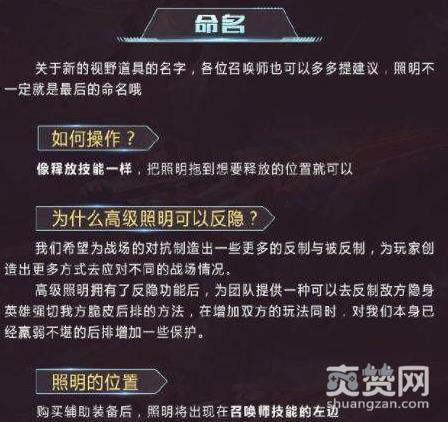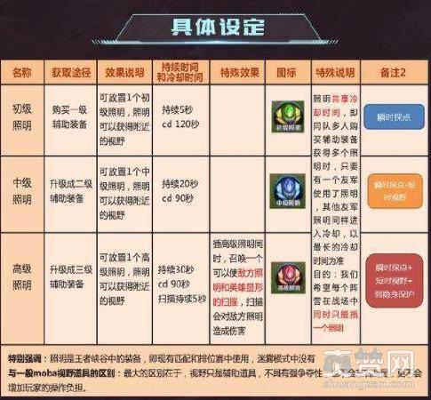 照明也分初级、中级和高级,初级中级可以用来探草丛,高级照明则可以有效的防止隐身英雄如荆轲、兰陵王切入。同队伍玩家同时只能开启一个照明,共享冷却时间。