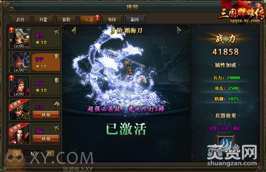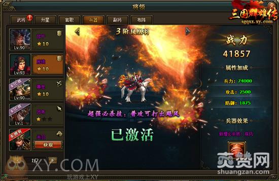 武器变神器,还有必杀技!2017最经典的策略页游XY游戏《三国群雄传》三阶武器震撼来袭!瞬间升级变身神器!最新的三阶武器不仅会为武将带来极致的属性提升,更有超强的必杀技助你纵横战场笑傲群雄!赶快加入XY游戏《三国群雄传》体验最新三阶武器为你带来的杀戮快感吧!