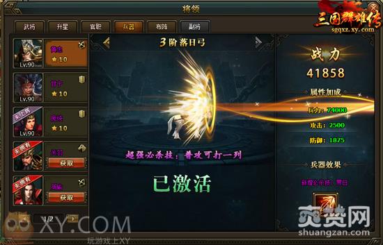 作为XY游戏《三国群雄传》中的蜀国老将,黄忠所拥有的三阶神兵名为落日弓,蕴含着追风逐日的巨大力量。增加各项属性自然不在话下,特别是落日弓所附带的超强必杀技:贯日!绝对算得上是秒杀一大片的战场神器了!当黄忠在战场上使用普攻的时候,将会有几率施放贯日,宛如后羿射日般贯穿一切,攻击整个横列队伍!所以老将黄忠这一箭下去,那就是一箭死一列的节奏!