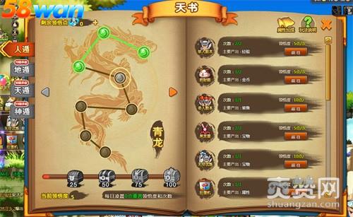 玩家当天进行第二次免费招财需要天书领悟度达到50,以及领取金币也需要玩家的天书领悟度达到50点.玩家完成天书任务就能获得领悟度,打开天书界面,就可以看到游戏中的各种玩法.天书界面的任务都是玩家每日必做任务,玩家在完成任务的同时就可以获得天书领悟度.
