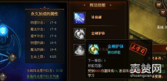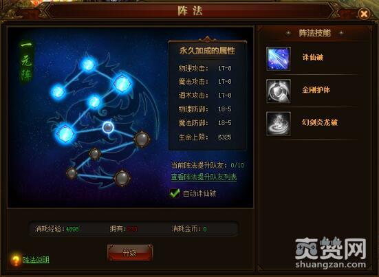 这就是傲天烈火封神的阵法系统,与传闻中的团队阵法还是略有些差别。一方面是可以帮助玩家独立提升各类属性和战斗力,另一方面又是团队作战的神器,随着队友的增多阵法威力会更强大。看看一元阵的威力,物/魔/道攻+17~8,物/魔防18~5,生命上限又提升了6325,而且自动释放技能诛仙破。