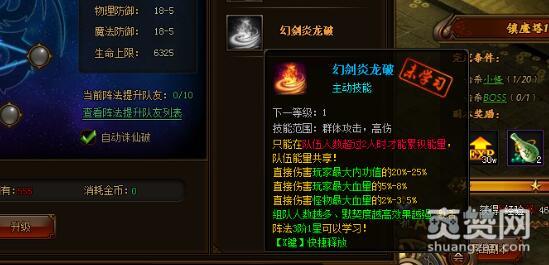 看看最后一个主动技能“幻剑炎龙破”,一听霸气的名称就知道是必杀。群体攻击,高伤的技能,这一切只能在队伍人数超过2人的时候才能累积能量。直接伤害玩家最大内功值的20%~25%,玩家最大血量的5%~8%,怪物最大血量的2%~3.5%。组队人数越多,默契度越高效果越好。想要激活这个技能,需要傲天烈火封神中阵法达到3阶1星。